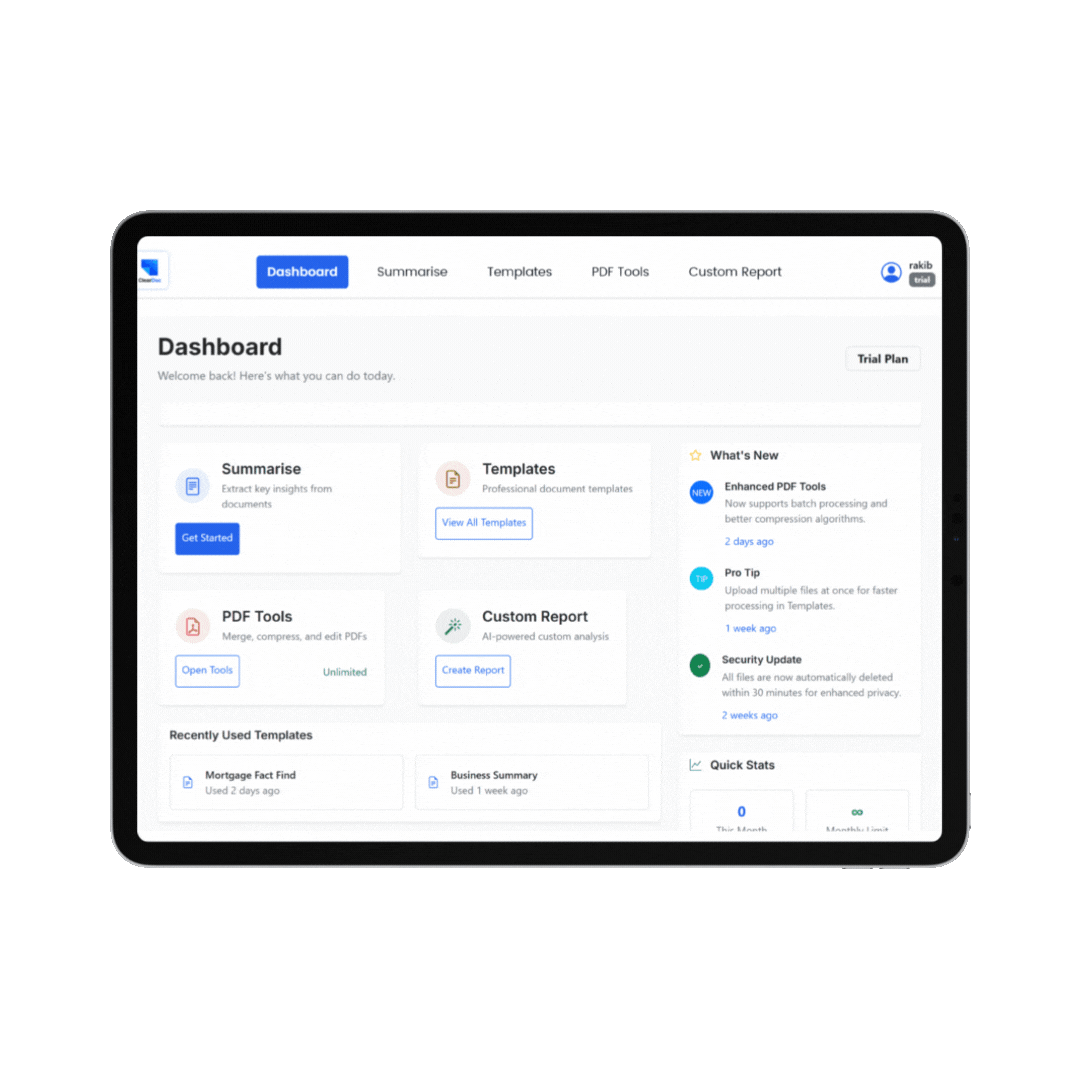 Whether you’re a freelancer, landlord, or consultant, ClearDoc gives you all the tools you need to process, summarise, and convert documents — without the stress. Our AI-powered platform saves you time, keeps your data safe, and delivers results you can trust.
